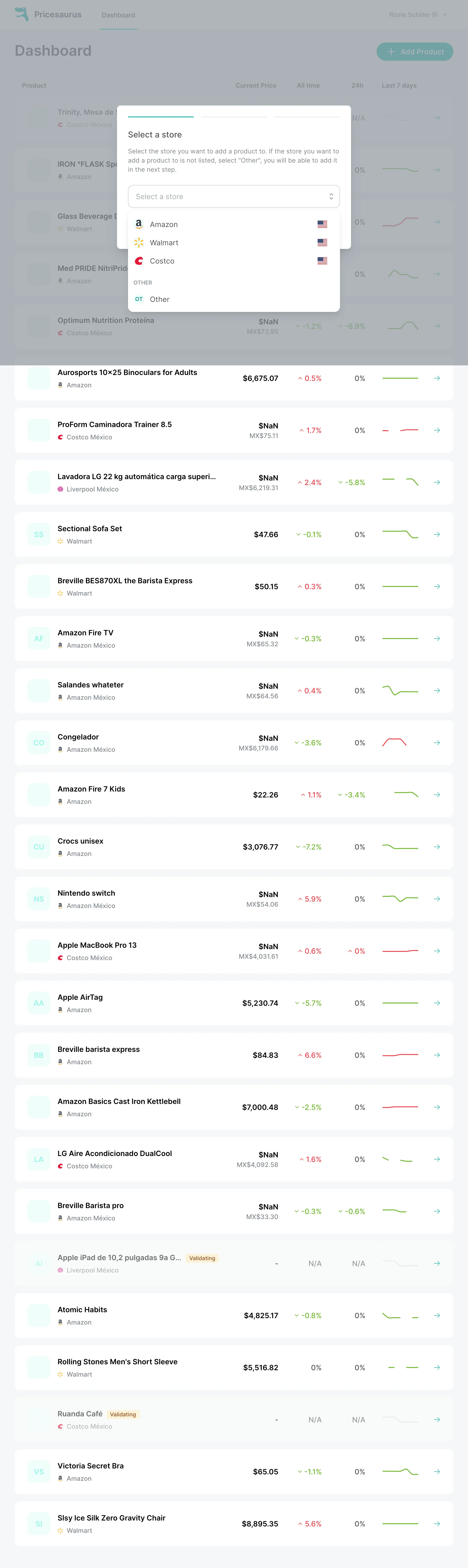 - Pricesaurus is a web and mobile application (coming soon) designed to track product prices from top online stores, allowing users to view price histories and receive alerts for price changes.